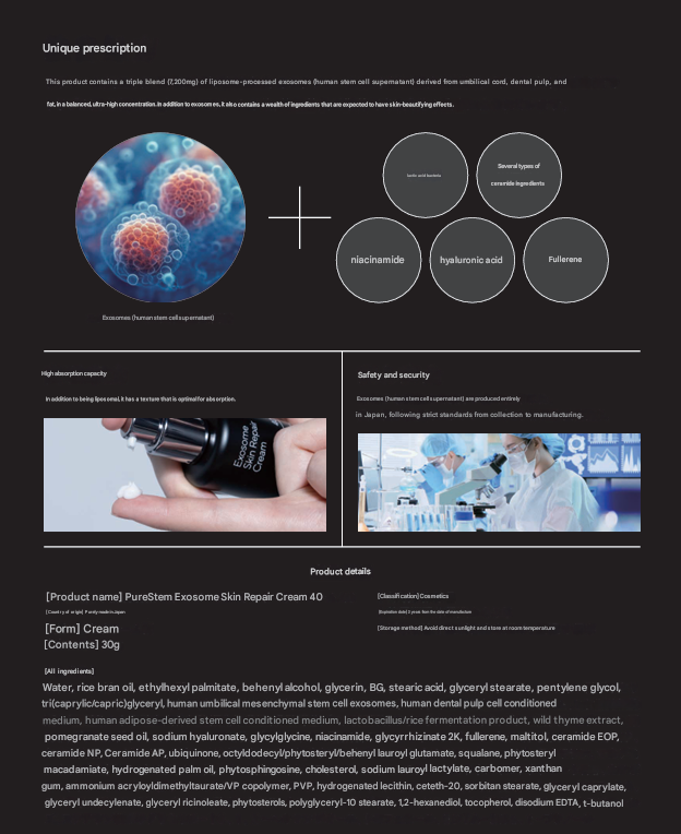 This cream contains the highest concentration (40%) of exosomes (human stem cell supernatant) in Japan.