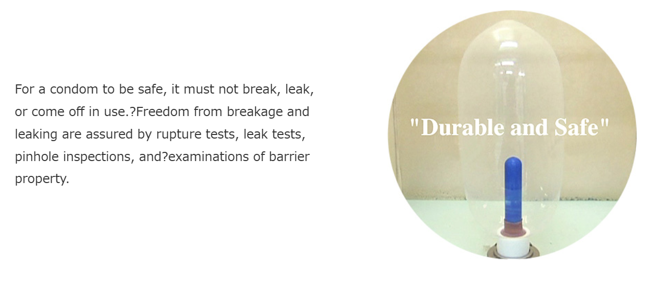 For the safety of the condom, it shall not break, leak or fall off in use. Ensure no damage and leakage through fracture test, leakage test, pinhole inspection and barrier performance inspection.